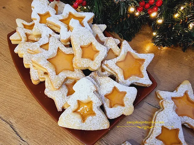 Ciasto wyjmujemy z lodówki i rozwałkowujemy cienko. Wykrajamy ciastka parzyście jedno całe a jedno do pary z wyciętym kształtem w środku. Np. Duża gwiazdką wycinamy dwa ciastka a w jednym robimy mniejszą gwiazdką dziurkę w środku.