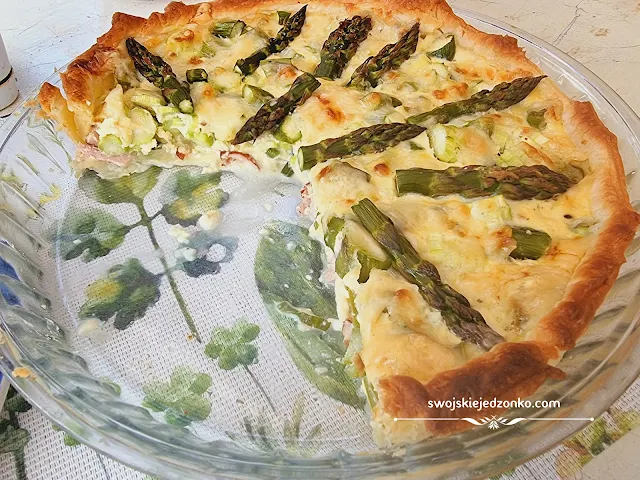 Szparagi płuczemy, odłamujemy twarde końcówki, odłamane twarde końcówki obieramy i kroimy drobniutko, główki odcinamy i odkładamy na wierzch. Pozostałe części szparagów kroimy w 1 cm kawałki. Śmietanę mieszamy z jajkami, doprawiamy solą i pieprzem i mieszamy. Formę do tarty wysmarowujemy masłem i wykładamy ciastem francuskim. Na ciasto układamy pokrojoną w kawałeczki szynkę, gorgonzolę i szczypiorek, następnie pokrojone szparagi tylko bez główek, polewamy śmietaną z jajkami i posypujemy startym parmezanem i na wierzchu układamy główki szparagów. Po wierzchu solimy odrobinę. Wstawiamy do piekarnika rozgrzanego do 180 stopni góra dół i pieczemy ok 30-40 minut. aż się ładnie zrumieni. Kroimy jak lekko przestygnie. Smacznego!!